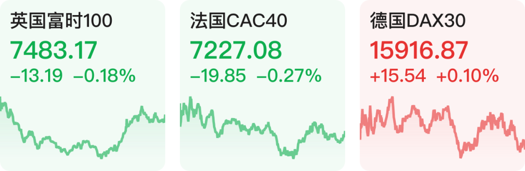欧洲三大指数涨跌不一。截至收盘,英国富时100指数跌0.18%,法国CAC40指数跌0.27%,德国DAX30指数涨0.1%。