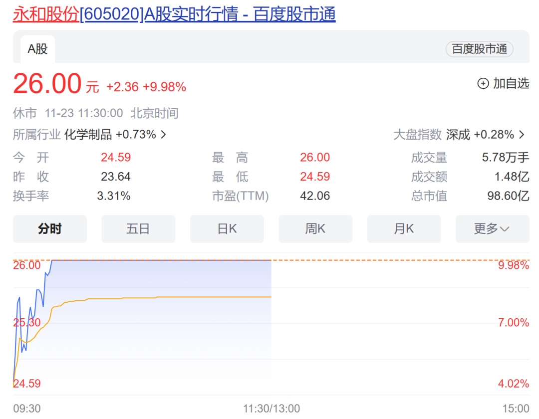 制冷剂概念股早间异军突起,氟概念板块高开高走,涨逾1%。永和股份放巨量涨停,开盘不到5分钟成交就超过昨日全天成交,三美股份、巨化股份等涨幅居前。