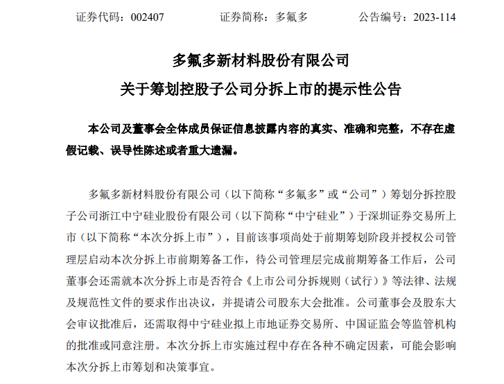 11月28日晚间多氟多公告,根据公司总体发展规划和战略布局,结合中宁硅业的发展现状,为了更好地整合资源,拓宽子公司融资渠道,更好地发展中宁硅业高纯硅烷、四氟化硅等特气业务,同意公司启动中宁硅业分拆上市的相关筹划工作。