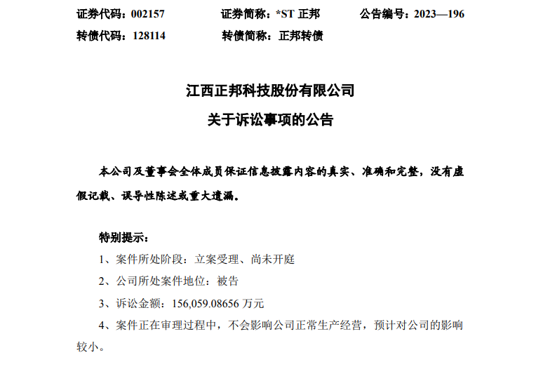 自前次披露的累计诉讼、仲裁公告至2023年8月30日,*ST正邦及控股子公司累计新增涉及诉讼、仲裁事项的相关金额合计24.15亿元,其中,上市公司及控股子公司作为原告涉及的诉讼金额为709.65万元;上市公司及控股子公司作为被告或共同被告涉及的诉讼、仲裁事项合计金额为24.08亿元。