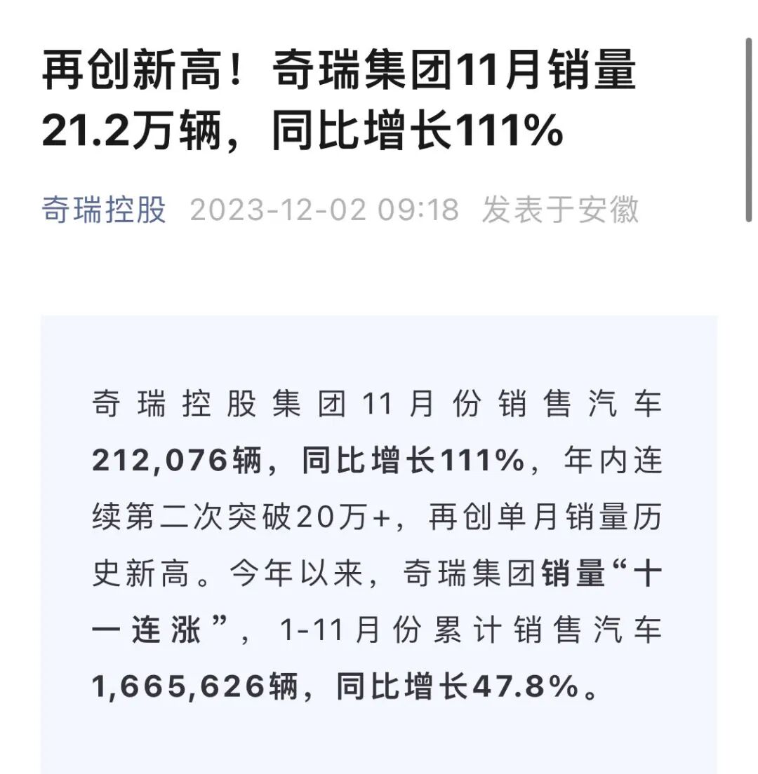 奇瑞集团11月销售汽车21.2万辆 同比增长111%