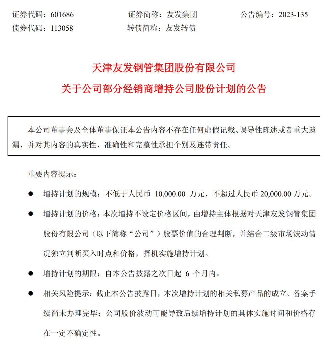 据了解,友发集团经销商群体的增持目的,是基于对公司未来发展前景的信心以及对公司投资价值的认同,拟通过增持公司股票,分享公司发展成果,实现公司长远发展与经销商利益的结合。