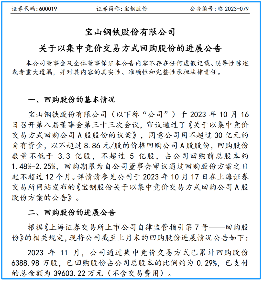宝钢股份(600019)在11月实施了较大规模的回购。公司今日晚间公告, 11 月,公司通过集中竞价交易方式已累计回购股份6388.98 万股,支付的总金额达3.96亿元。宝钢股份的回购方案披露于10月16日,公司拟用不超过30亿元回购,如今回购期限仅过去1个半月,公司累计回购总金额已经达到9.03亿元。