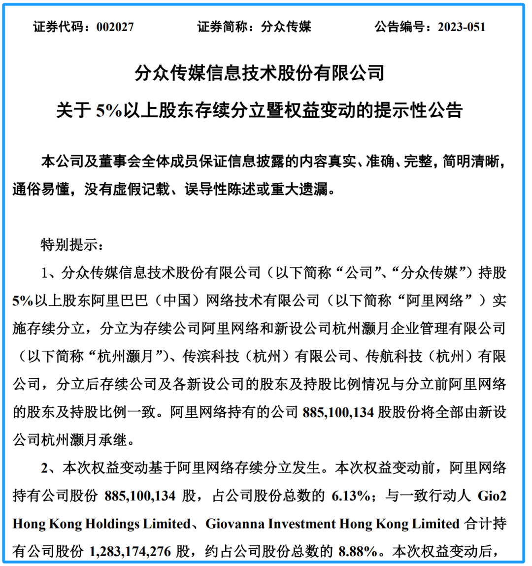 需要关注的是,本次存续分立及股权转让并不影响在上市公司的整体权益,分立后存续公司及各新设公司的股东及持股比例情况将与此前阿里网络一致。