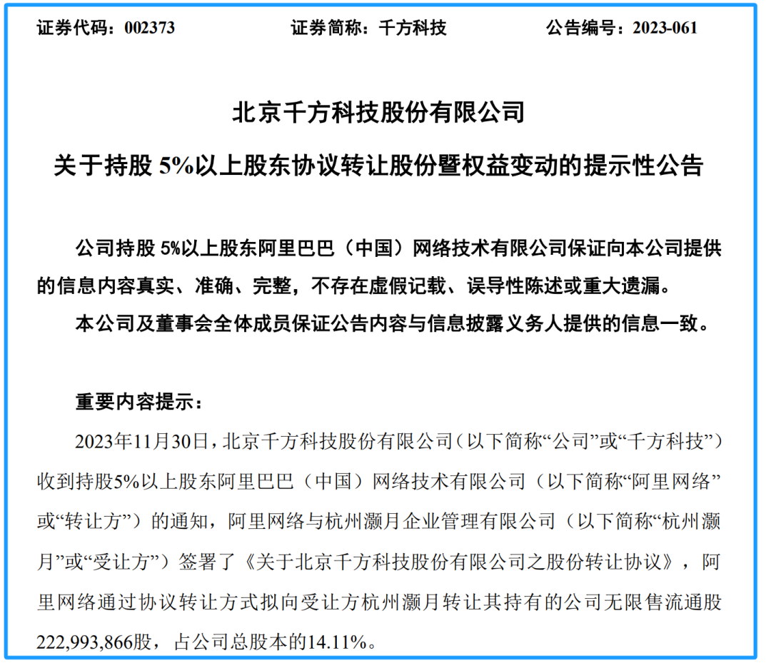 除此之外,千方科技也公告了同类事项,阿里网络拟将所持上市公司14.11%股份转让给杭州灏月,每股转让价格为12.08元,总价为26.94亿元。
