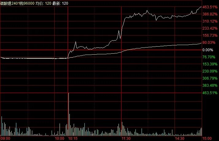 刚收市,就有投资者在微信群里发出感叹,贴出碳酸锂2401购96000期权走势图,引起一阵惊叹,这也让投资者感慨,原来虚值期权也有价值,末日轮上涨400倍。