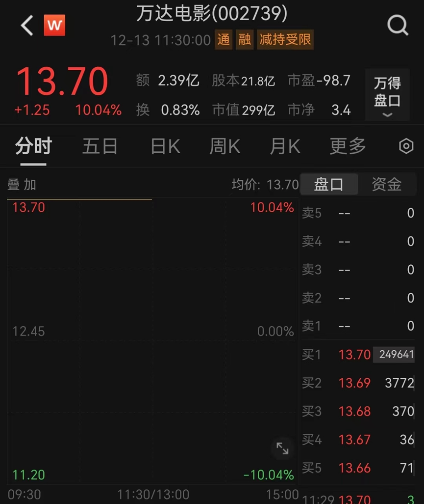 交易完成后,万达电影(002739)实控人,将从王健林变更为柯利明。12月13日,万达电影复牌一字涨停。