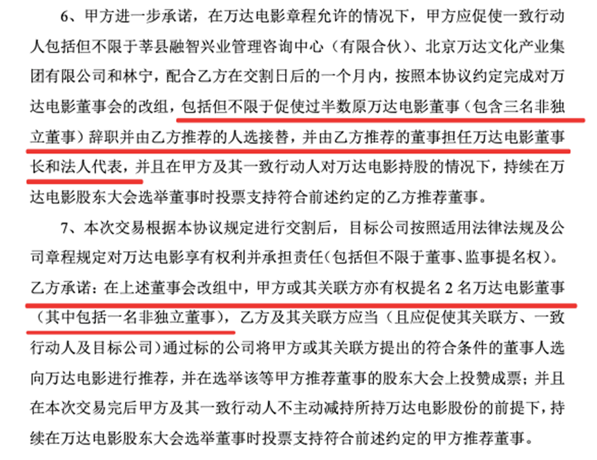 转让方已承诺,在万达电影章程允许的情况下,应促使一致行动人包括但不限于莘县融智兴业管理咨询中心(有限合伙)、万达文化集团和林宁,配合收购方在交割日后的一个月内,按照协议约定完成对万达电影董事会的改组。
