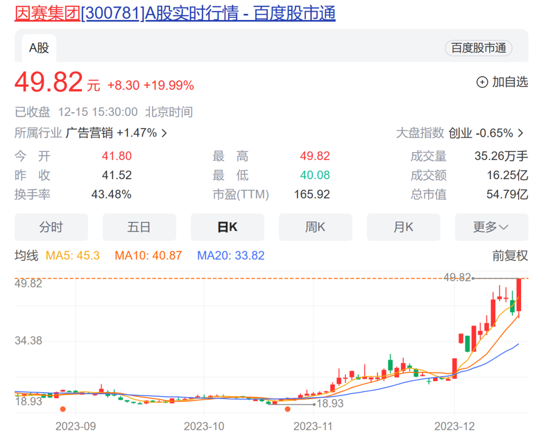因赛集团于2019年6月在创业板上市,是国内“品牌营销第一股”,业务范围涵盖战略咨询、品牌管理、数字整合营销、公关传播及媒介代理等五类服务。由于集AI应用、多模态模型、短剧游戏等多个热门概念于一身,该公司近期备受市场追捧,自12月1日以来,因赛集团月内股价已接近翻倍,最新收于49.82元/股的历史新高,当前市值约55亿元。