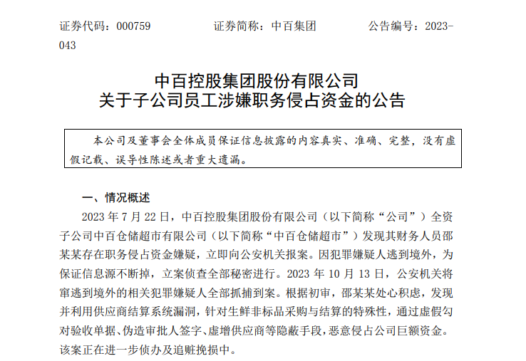 公告显示,2023年7月22日,中百集团全资子公司中百仓储超市有限公司(以下简称“中百仓储超市”)发现邵某某存在职务侵占资金嫌疑,立即向公安机关报案。
