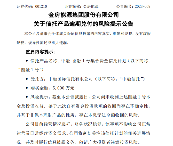 继永新光学、安利股份、微光股份、双成药业、三德科技等多家上市公司公告信托产品逾期兑付存风险后,最新一家“踩雷”中融信托的公司是金房能源(001210)。