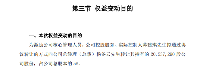 据香飘飘披露,上述权益变动前,蒋建琪持有香飘飘股2.27亿股,占公司总股本的55.44%,蒋建琪及其一致行动人陆家华、蒋晓莹、杭州志周合道企业管理合伙企业(有限合伙)合计持股2.99亿股,占公司总股本的 72.92%。杨冬云则未持有香飘飘股份。