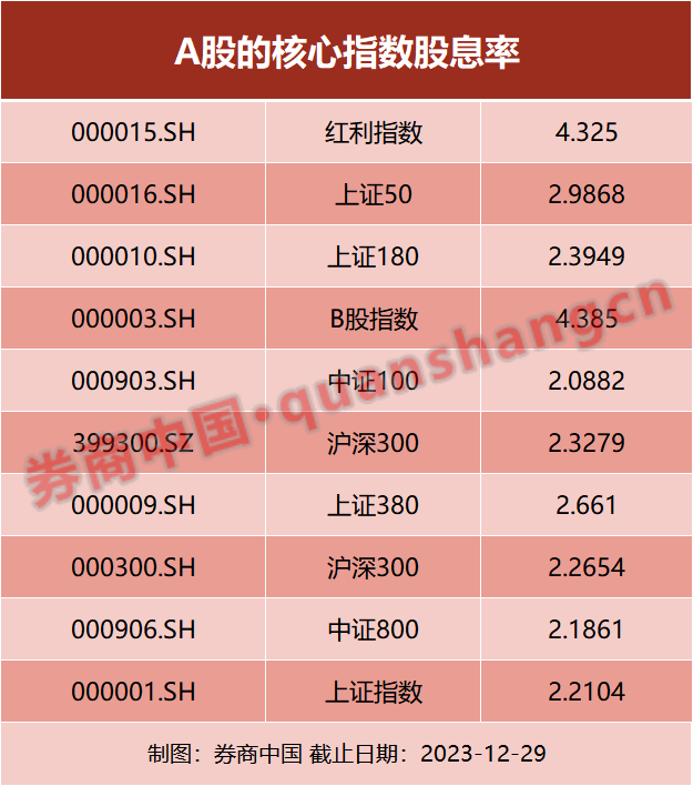 股票是披着股票外衣的债券,股票的分红派息能力是托底股市的终极能力,当前A股的股息率相比债券类资产更具吸引力。以红利指数来看,红利指数对应的最新股息率为4.325%,上证50指数对应的最新股息率为2.9868%,沪深300对应的股息率为2.2654%。而当前的十年期国债收益率已经跌至2.592%,A股核心指数当前的股息率相比来看对资金更具有吸引力。