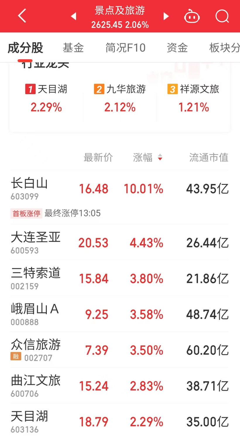 在此背景下,二级市场相关板块闻声大涨,其中旅游股午后再度走高,众信旅游直线拉升涨超5%。截至发稿,长白山涨停,众信旅游、大连圣亚、峨眉山A、三特索道、曲江文旅等涨幅居前。