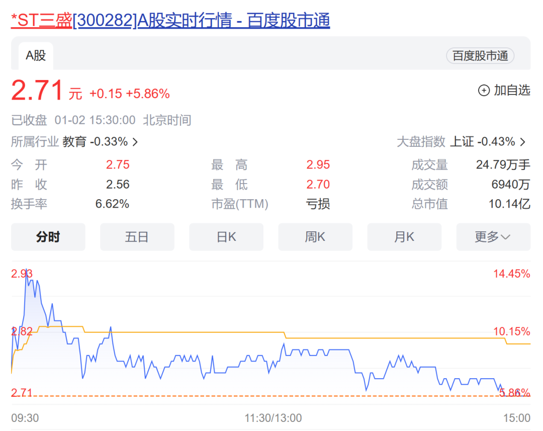 上述消息披露后的首个交易日,2024年1月2日,截至收盘*ST三盛放量大涨5.86%,盘中最大涨幅高达15%。