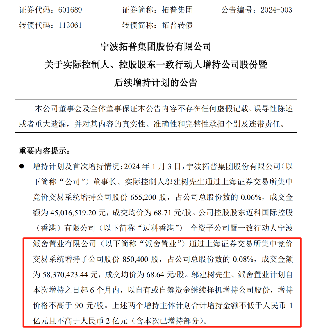 据拓普集团公告,1月3日,公司董事长、实控人邬建树及其一致行动人派舍置业分别通过集中竞价交易方式增持65.52万股、85.04万股,成交均价分别为68.71元/股、68.64元/股,成交金额分别为4501.65万元、5837.04万元,二者累计增持金额达1.03亿元。