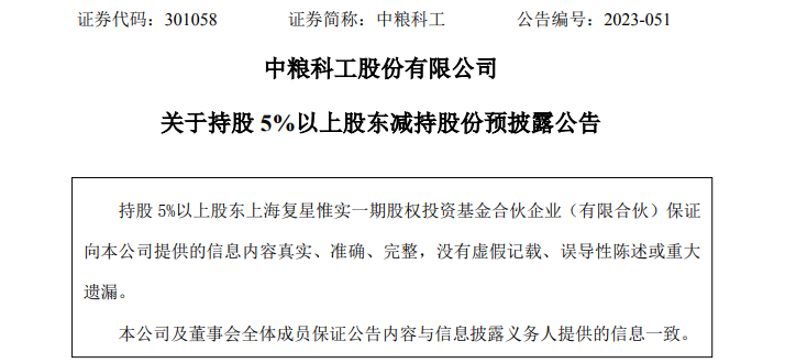 事实上,近两年来中粮科工长期处于复星惟实基金的减持计划中。2023年11月,中粮科工宣布,复星惟实基金前次权益变动计划期限已届满,期间累计减持公司约4%股份,持股比例由11.39%降至7.38%;而在2022年10月11日到2023年3月3日期间,复星惟实基金还曾减持中粮科工2561.38万股股份,占公司总股本的5%。