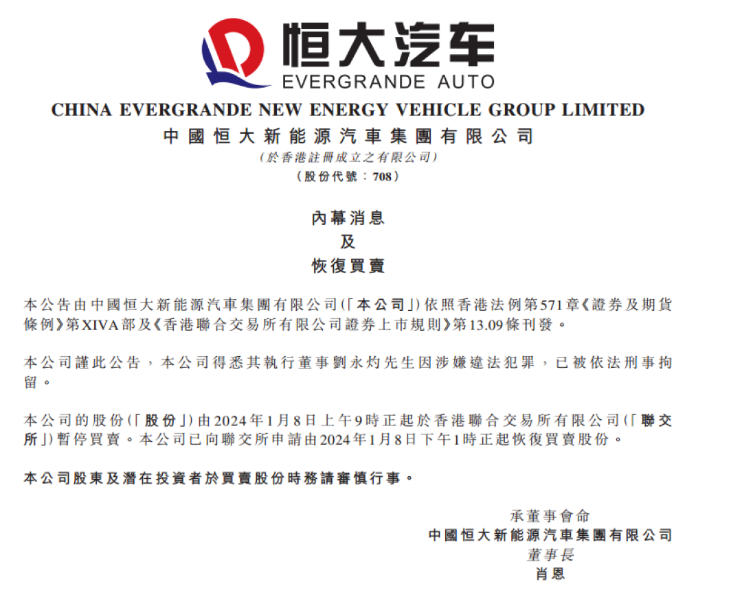 1月8日午间,恒大汽车(00708.HK)在停牌半日后正式披露了这一消息,刘永灼目前在恒大汽车担任执行董事。恒大汽车公告简要表示,刘永灼因涉嫌违法犯罪,已被依法刑事拘留,公司股票自1月8日下午1时正起恢复买卖股份。