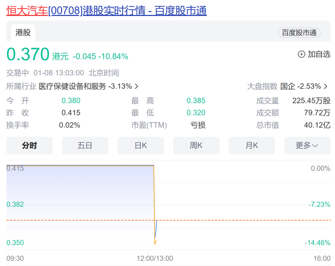 消息发布后,恒大汽车股价直线跳水,截至发稿最大跌幅达20%;中国恒大、恒大物业股价走势较为平稳。