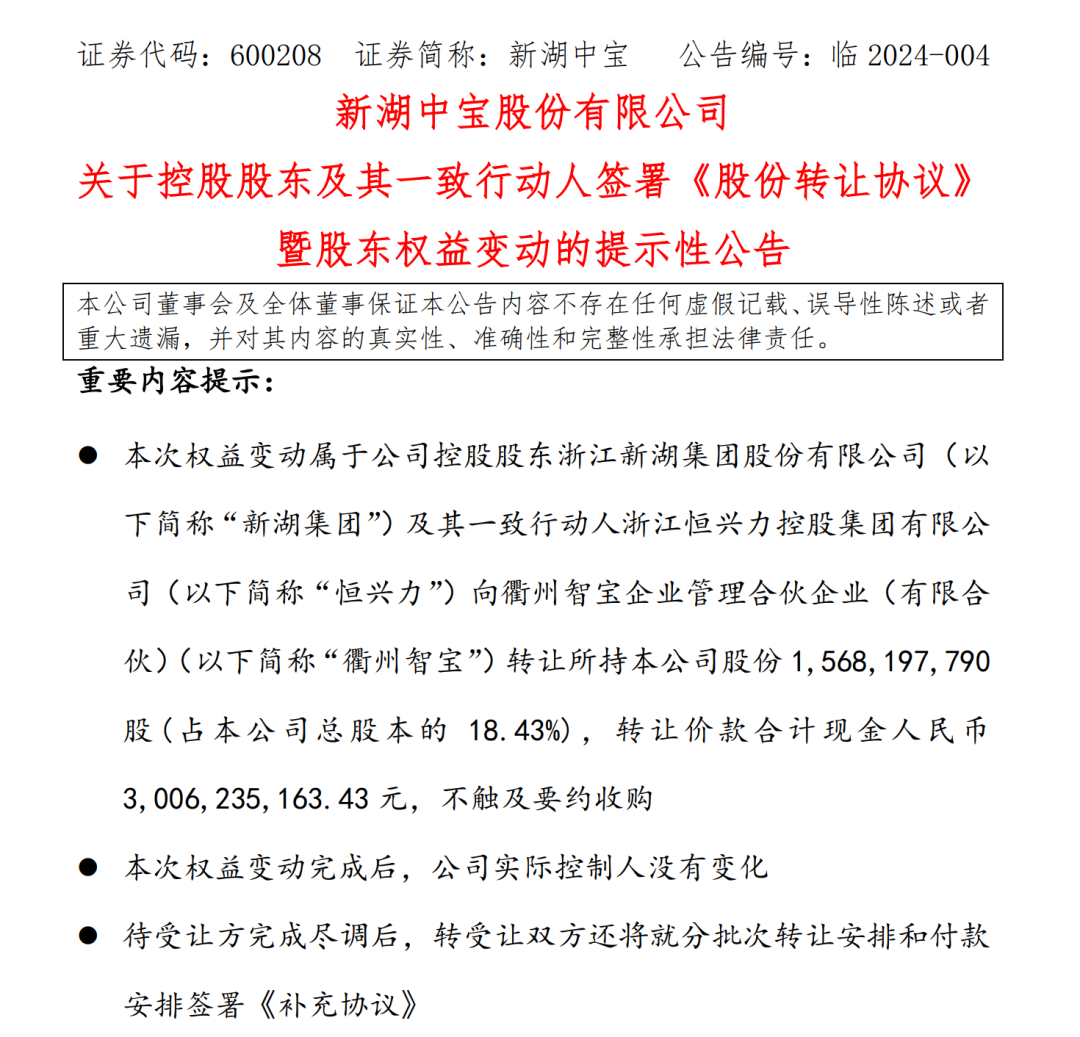 1月8日晚,新湖中宝公告显示,公司接到控股股东新湖集团的通知,为了进一步优化公司股东架构、争取地方政策支持、全面深化合作、推进公司转型,新湖集团及一致行动人浙江恒兴力控股集团,与衢州智宝企业管理合伙企业(有限合伙),于1月8日签署了《股权转让协议》。