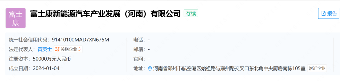 企查查APP显示,近日,富士康新能源汽车产业发展(河南)有限公司成立,法定代表人为黄英士,注册资本5亿元。新设公司经营范围不仅涵盖汽车零部件及配件制造、电机制造、通用零部件制造、汽车零部件研发、新材料技术研发,还涉及了新能源汽车整车销售、汽车零配件批发等。
