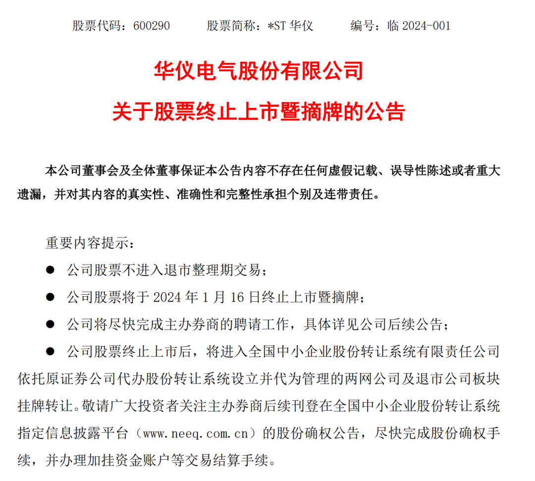 1月9日晚间,*ST华仪公告,公司收到上交所《关于华仪电气股份有限公司股票终止上市的决定》,上交所决定终止公司股票上市。公司股票不进入退市整理期交易,将于2024年1月16日终止上市暨摘牌。由此,* ST华仪成为2024年A股第一只退市股。