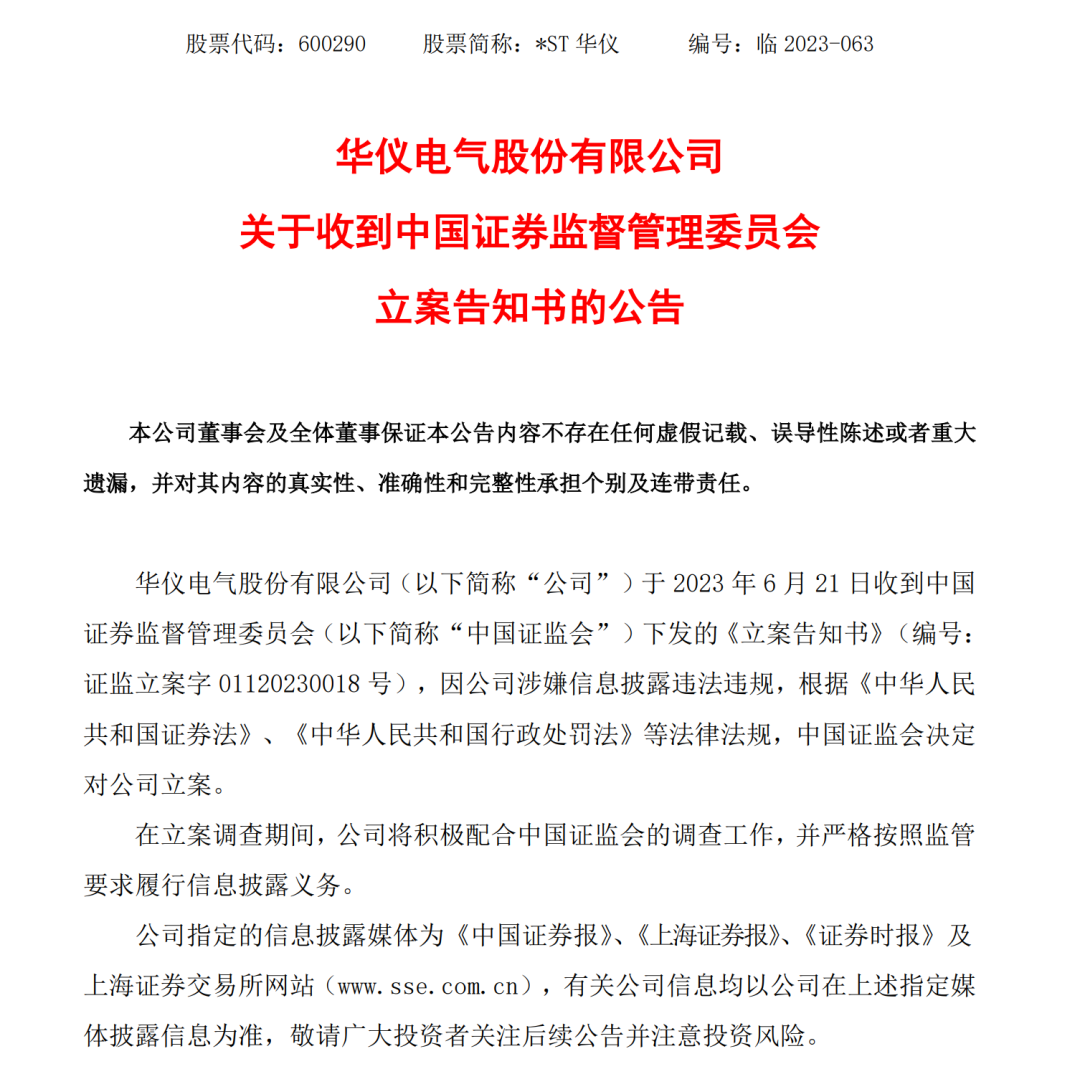 2023年6月21日,*ST华仪公告,公司当日收到中国证监会下发的《立案告知书》,因公司涉嫌信息披露违法违规,中国证监会决定对公司立案。时隔半年,*ST华仪12月21日晚公告,因公司重大事项尚需核实,公司股票于12月22日起开始停牌,预计停牌时间不超过3个交易日。