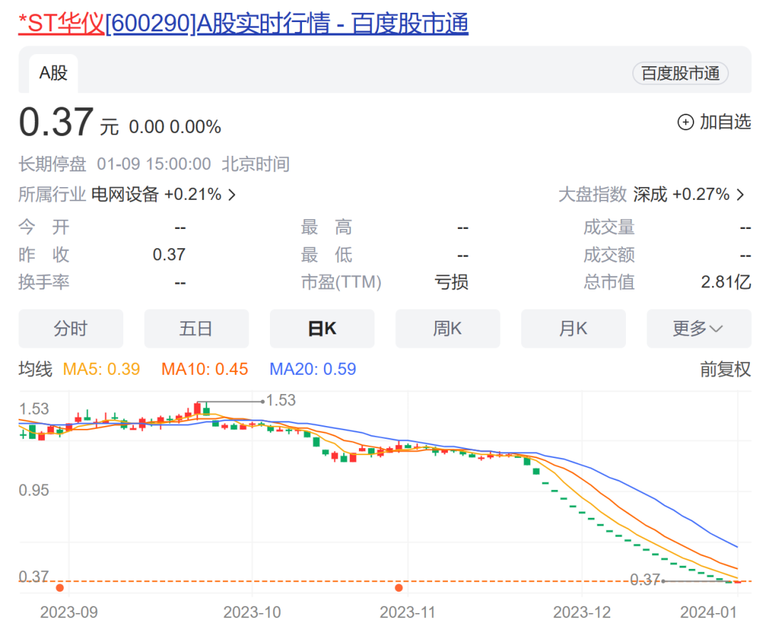 具体看,*ST华仪股票因连续20个交易日(2023年11月28日至2023年12月25日)的收盘价均低于1元,已触及交易类退市指标。值得注意的是,交易类强制退市公司股票不进入退市整理期交易。