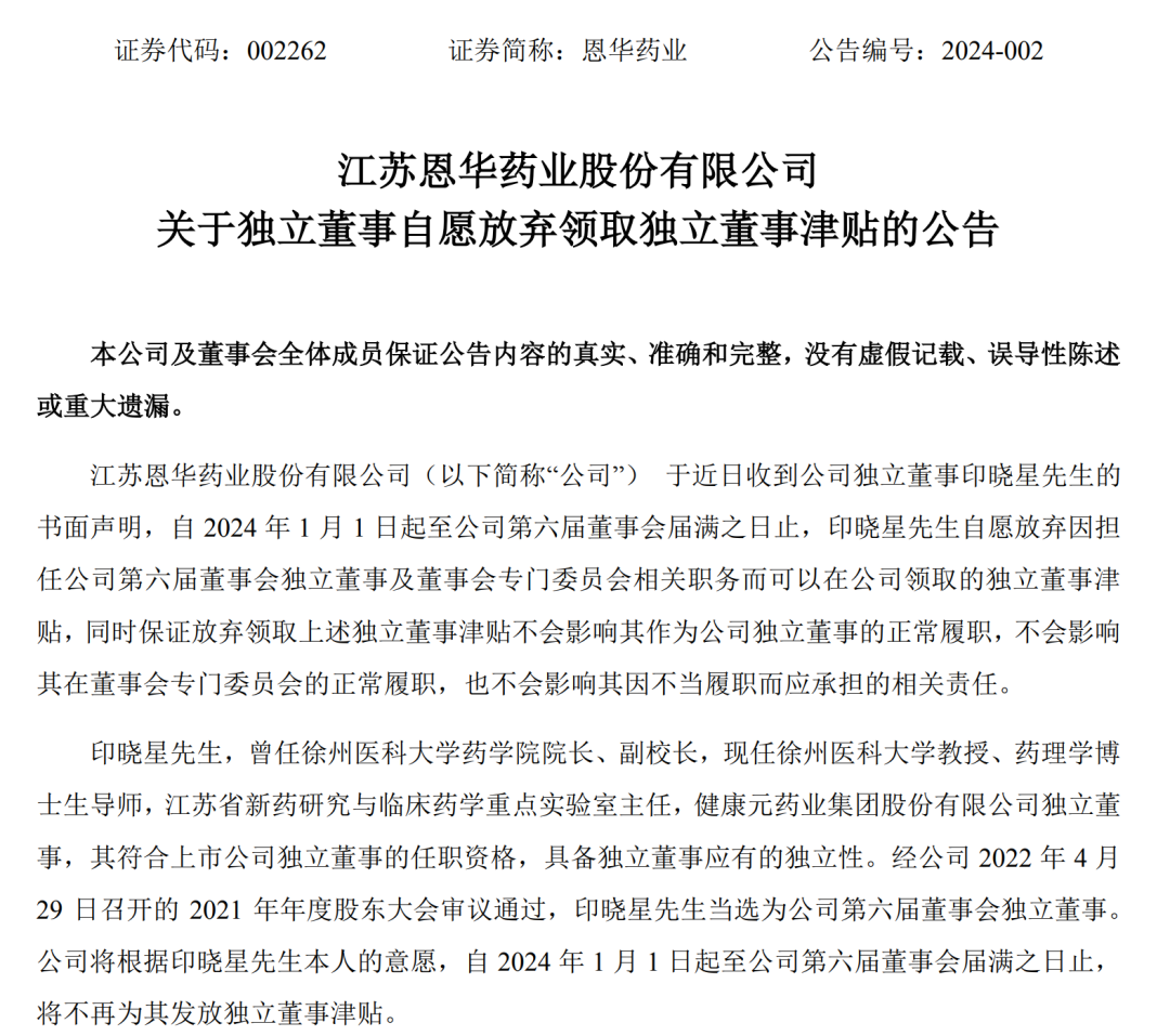 1月9日晚,A股公司健康元(600380)、恩华药业(002262)均公告称,公司于近日收到独立董事印晓星的书面声明,自今年1月1日起至公司现任董事会届满之日,印晓星自愿放弃因担任公司独立董事及董事会专门委员会相关职务而可以在公司领取的独立董事津贴。