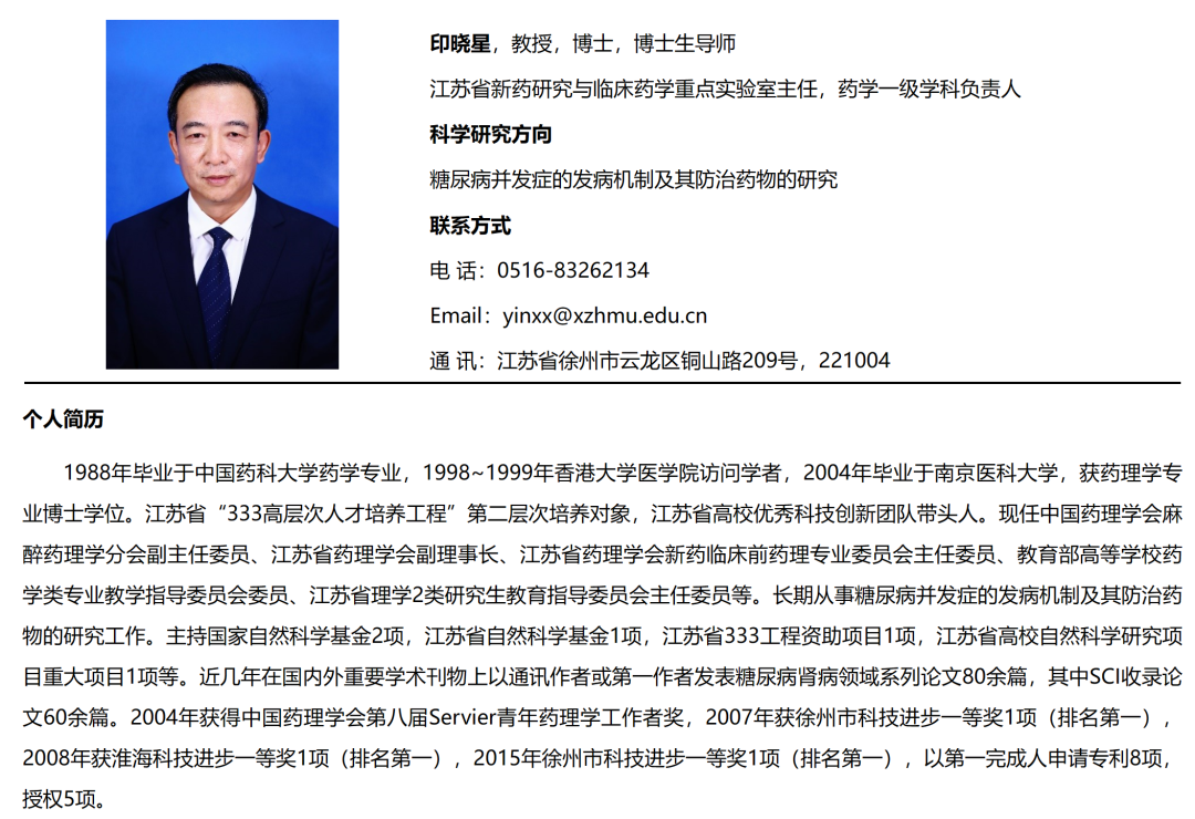 印晓星出生于1966年,博士研究生学历。其现任徐州医科大学教授、药理学博士生导师,江苏省新药研究与临床药学重点实验室主任。同时,他为教育部高等学校药学类专业教学指导委员会委员、江苏省理学2类研究生教育指导委员会主任委员、江苏省药理学会副理事长等。