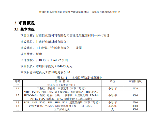 报告书显示,巨化高性能硅氟新材料一体化项目总投资410.47亿元,占地面积8118.13亩,为酒泉、玉门市重大招商引资项目,主要建设内容为硅氟新材料及其配套设施,包括硅产业、氯碱工业、氟化工产业等板块。
