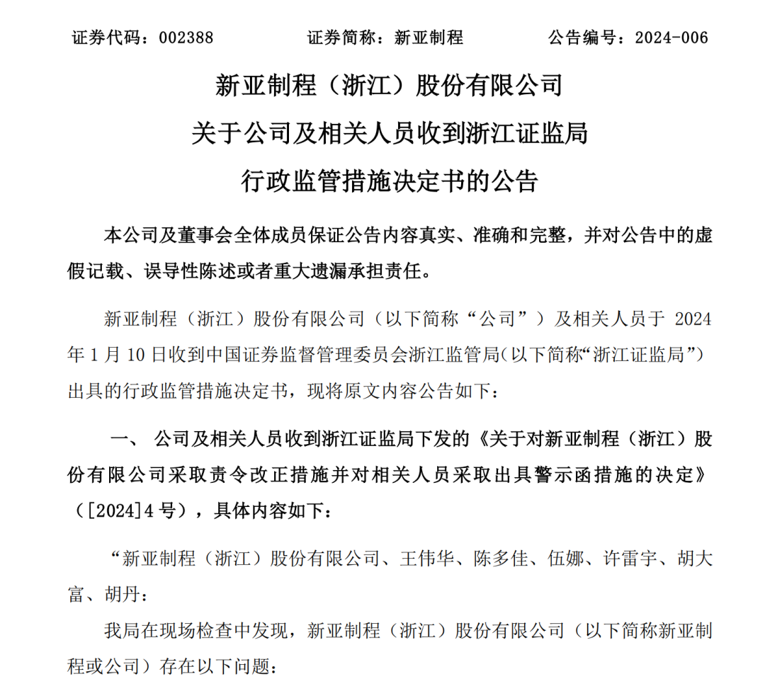 新亚制程及相关人员亦同时收到浙江证监局行政监管措施决定书。