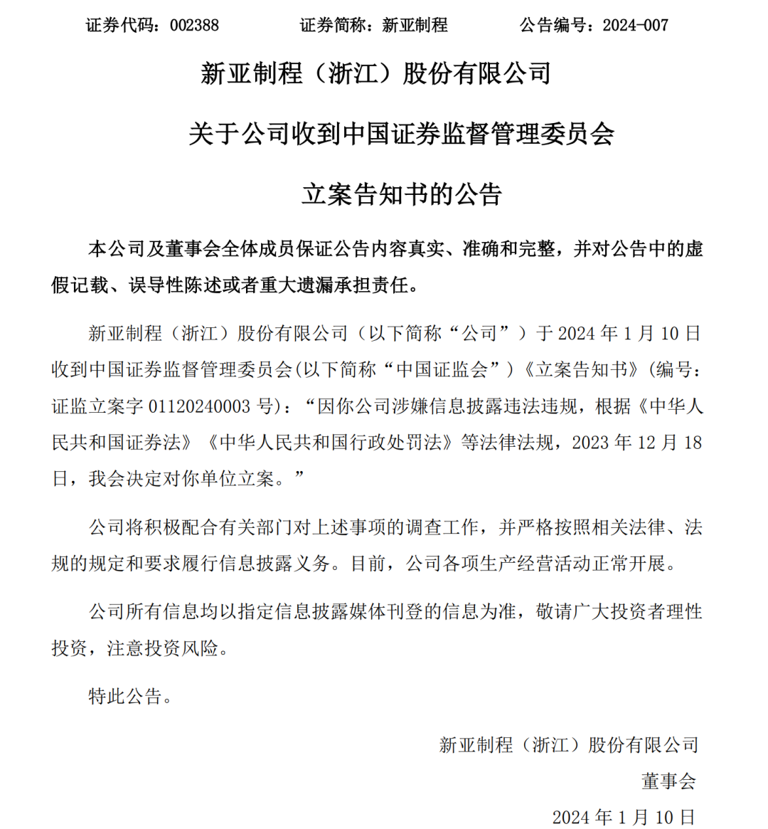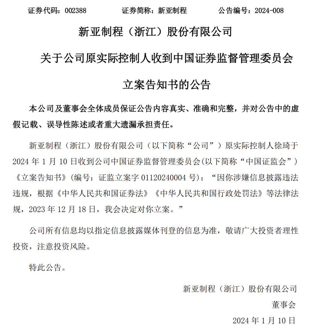1月10日晚间,因存在多项违规,新亚制程(002388)发布公司及原控股股东收到浙江证监局行政监管措施决定书的多则公告。同时,新亚制程及原实控人徐琦因涉嫌信披违法违规被中国证监会立案。