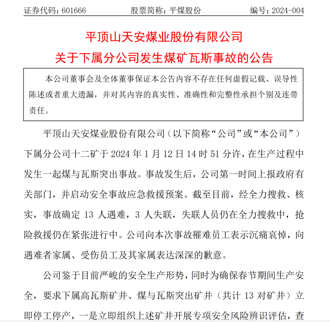 1月14日晚间平煤股份(601666)公告,该公司下属分公司十二矿于2024年1月12日14时51分许,在生产过程中发生一起煤与瓦斯突出事故。