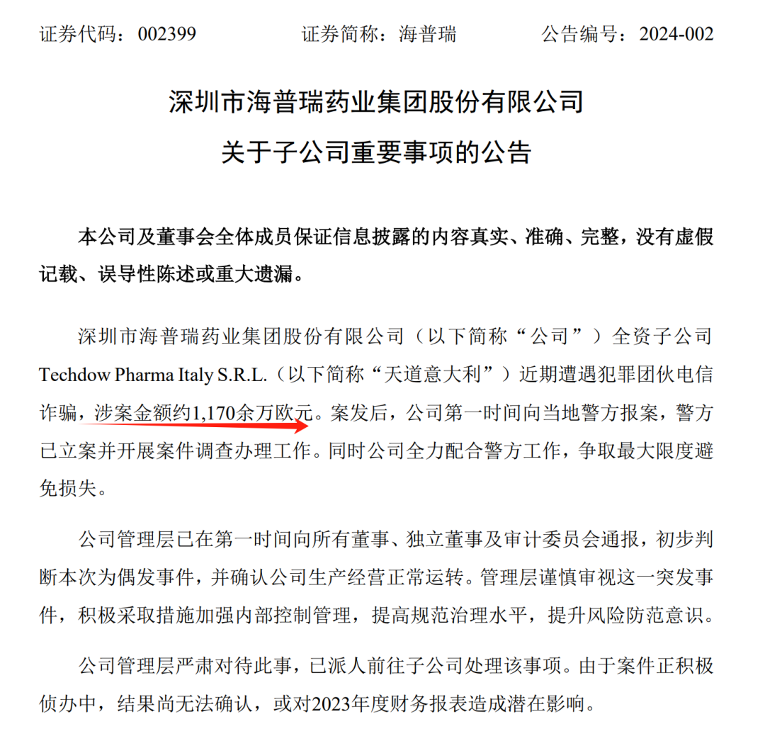 海普瑞1998年成立于深圳,是拥有A+H双融资平台的跨国制药企业。1月14日的公告显示,其全资子公司Techdow Pharma Italy S.R.L.(天道意大利)近期遭遇犯罪团伙电信诈骗,涉案金额约1170余万欧元。