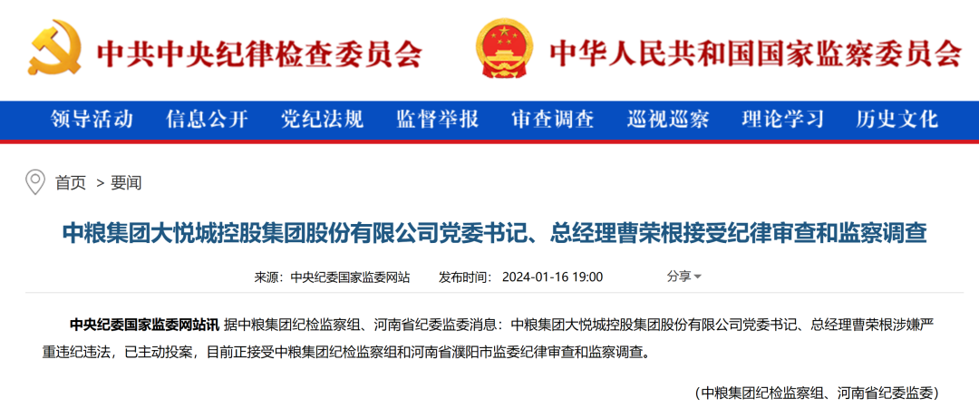 中央纪委国家监委网站1月16日披露,据中粮集团纪检监察组、河南省纪委监委消息:中粮集团大悦城控股集团股份有限公司党委书记、总经理曹荣根涉嫌严重违纪违法,已主动投案,目前正接受中粮集团纪检监察组和河南省濮阳市监委纪律审查和监察调查。