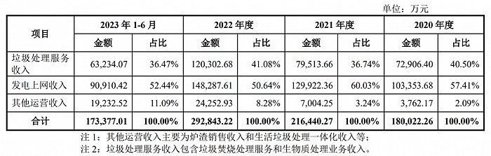 该公司项目运营收入包括垃圾处理服务、发电上网及其他运营收入。2023年上半年,垃圾处理服务收入和发电上网收入分别占总营收的36.47%和52.44%。