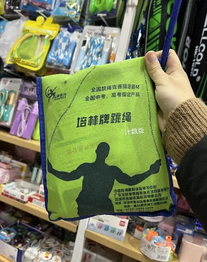 在重庆,记者以家长身份走访主城区多家中学周边文具店,问及是否售卖“中考跳绳”时,多名店主不约而同向记者推荐同一品牌——培林牌跳绳。