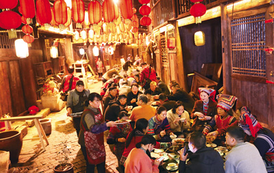 图为春节临近,湖南省永州市江永县民俗文化街年味渐浓,人们在文化街品味油茶宴。