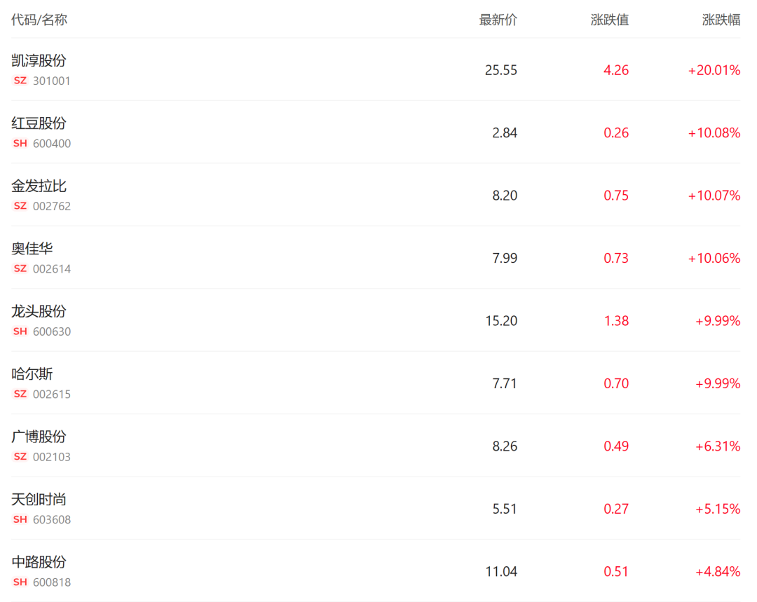 网红经济板块早间高开,盘中一度大涨近3%。凯淳股份高开后秒速20%涨停,金发拉比、奥佳华、哈尔斯等多股强势涨停。