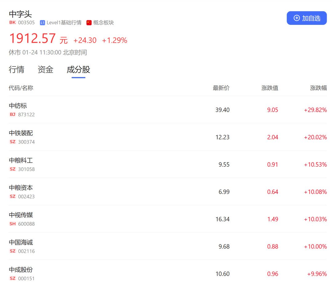 今日,中字头概念盘中持续走高,中视传媒4天3板,中纺标、中铁装配、节能铁汉涨超10%,中机认检、中公高科、中邮科技、中国海诚等跟涨。