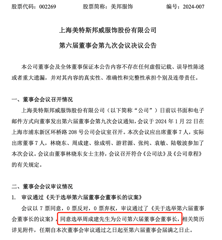 今年1月,美邦服饰管理层完成更迭。1月5日,公司公告,董事长胡佳佳因个人原因申请辞去公司董事长、董事等职务。1月22日晚,美邦服饰公告,公司董事会选举周成建为公司董事长。