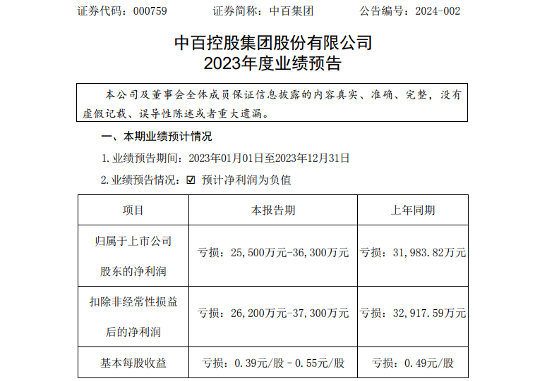 1月29日晚间中百集团发布2023年业绩预告显示,期内预计亏损2.55亿元—3.63亿元,上年同期亏损为3.2亿元;预计扣非净利润亏损2.62亿元—3.73亿元,上年同期亏损3.29亿元;基本每股收益亏损0.39元/股—0.5元/股,上年同期亏损0.49元/股。
