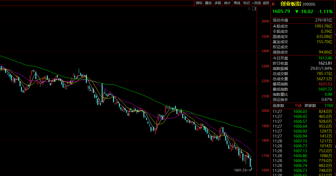 今日早盘,A股低开低走,科创50指数再创历史新低;创业板指逼近1600点,创4年多来新低。盘面上,种业、业绩预增、船舶、人脑工程等少数板块表现相对活跃,仓储物流、酒店餐饮、酿酒、房地产等板块跌幅居前。