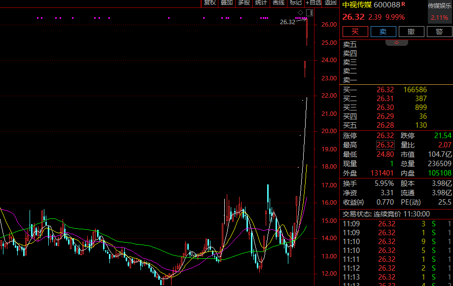 早间,传媒娱乐股逆势走强,板块指数放量涨逾2%,半日成交超昨日全天成交。龙头中视传媒携扭亏为盈预告,高开后再度秒涨停,这已是其连续第7日封板,股价创近5年新高,流金科技、中文在线等涨停或涨超10%。