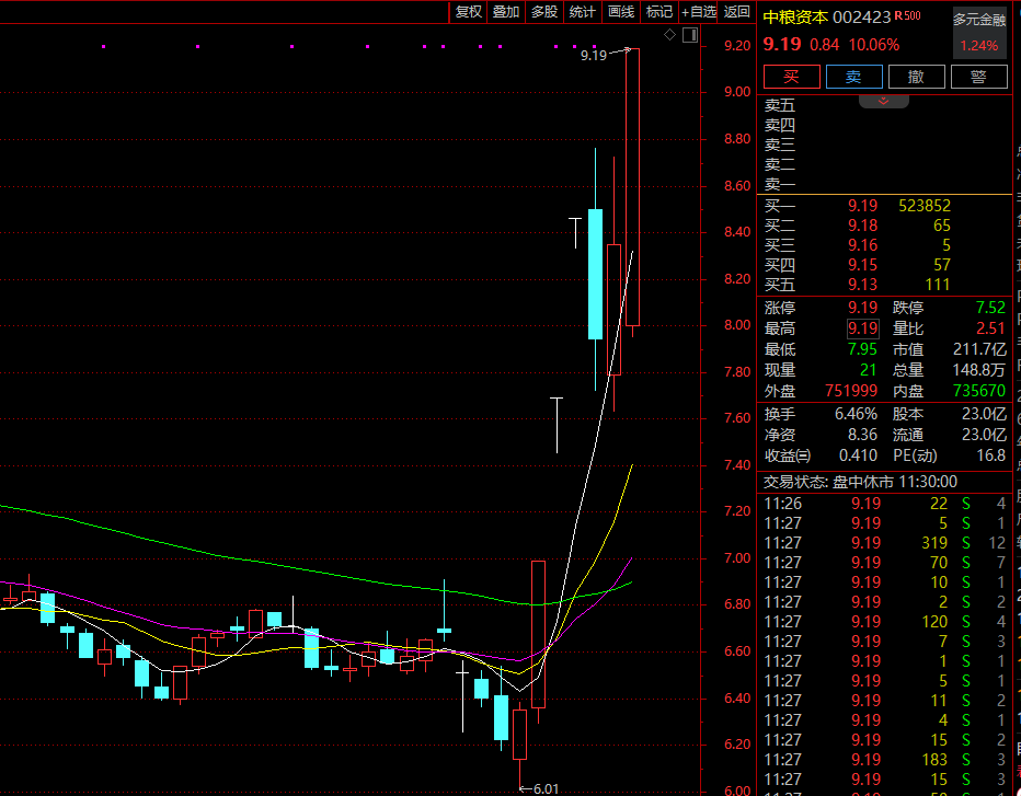 值得注意的是,在大盘危机的时候,中字头和银行等大盘蓝筹股再度集体拉升,各指数跌幅迅速缩小,其中,中粮资本再度涨停,6个交易日内4个涨停,累计涨幅为44.72%。
