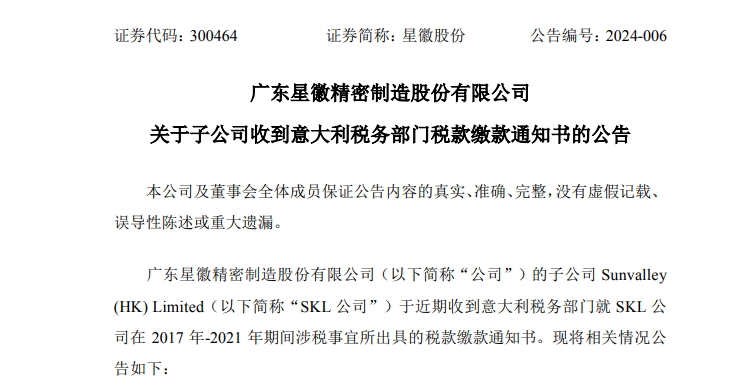 屋漏偏逢连夜雨。星徽股份(300464)子公司STK公司刚收到美国税务部门税款缴款通知书不久,子公司SKL公司又收到意大利税务部门税款缴款通知书。