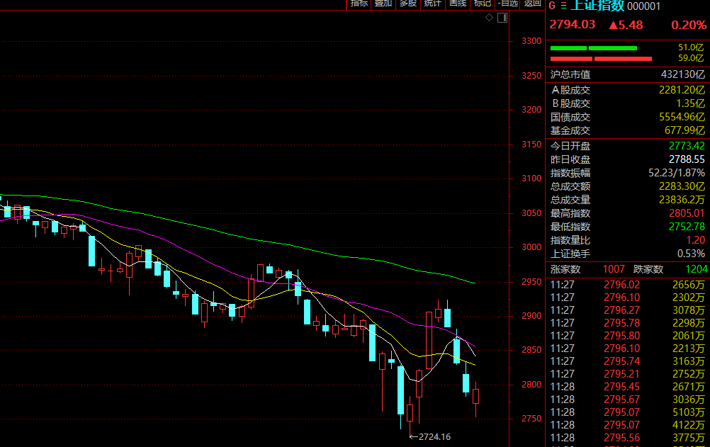 今日早盘,A股探底回升,成长股表现最优,科创50、创业板指盘中均大涨超2%,上证指数也一度冲上2800点。