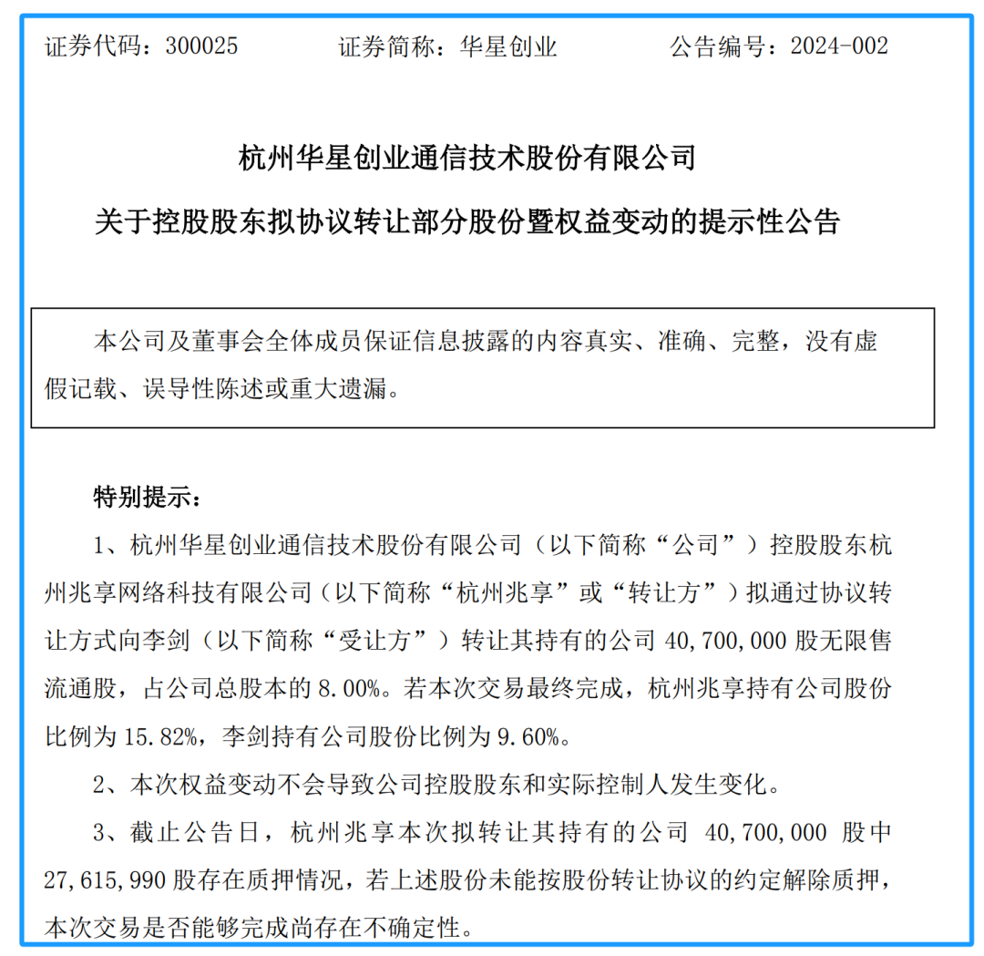 2月1日晚间,华星创业披露,公司控股股东杭州兆享网络科技有限公司(下称“杭州兆享”)拟通过协议转让方式向自然人李剑转让其持有的公司4070万股无限售流通股,占公司总股本的8%。