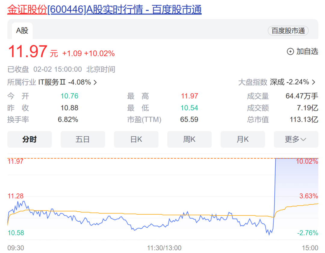 临近尾盘,大金融板块逆势拉升,金证股份直线涨停。金证股份发布的业绩预告显示,预计2023年全年归母净利润盈利3.5亿元至4.17亿元,同比上年增30%至55%。